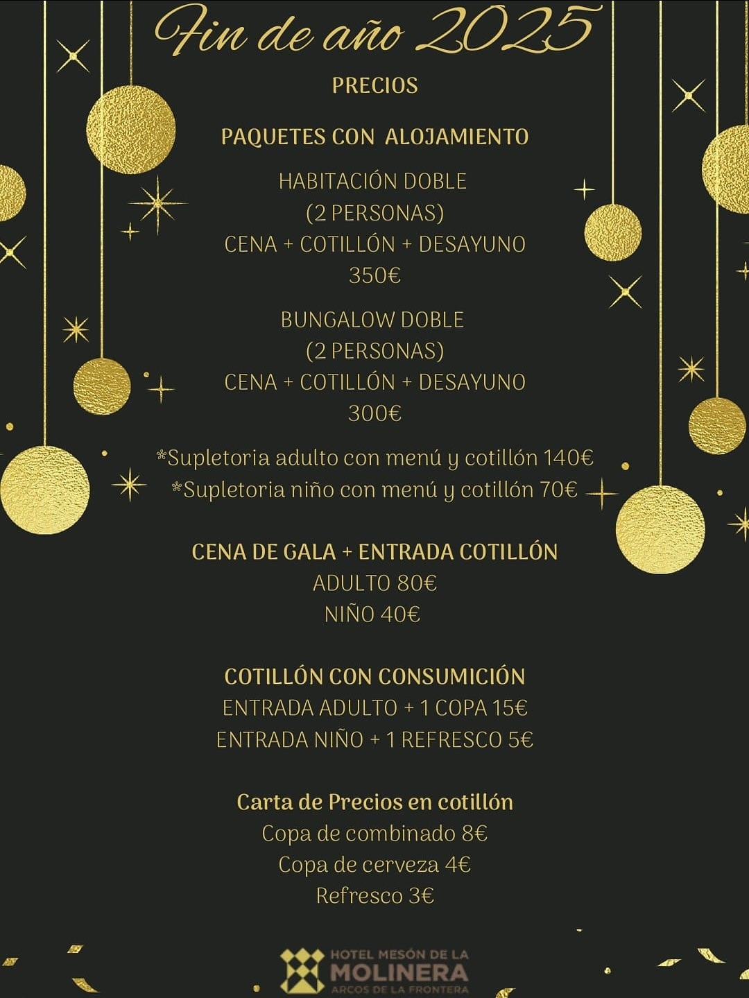 COTILLÓN FIN DE AÑO HOTEL MESÓN DE LA MOLINERA COTILLÓN FIN DE AÑO HOTEL MESÓN DE LA MOLINERA 31 DE DICIEMBRE 2025 + Añadir Google Calendar + exportación iCal / Outlook 00 días 00 horas 00 minutos 00 segundos Fecha Dic 31 2025 Hora 21:00 - 23:55 Compartir este evento
